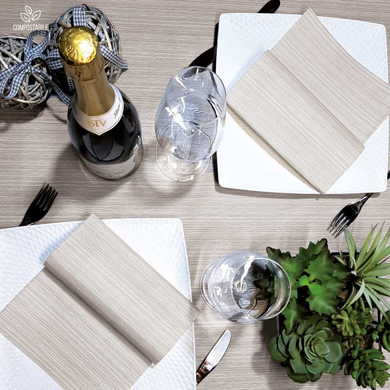 Tovaglie monouso per ristoranti prodotte con un materiale di derivazione naturale, le fibre di cellulosa sono fissate tenacemente da un bagno di lattice, la resistenza alla trazione è superiore alla cellulosa tradizionale. Il materiale si presenta alla vista liscio, è morbido al tatto ed è estremamente assorbente.